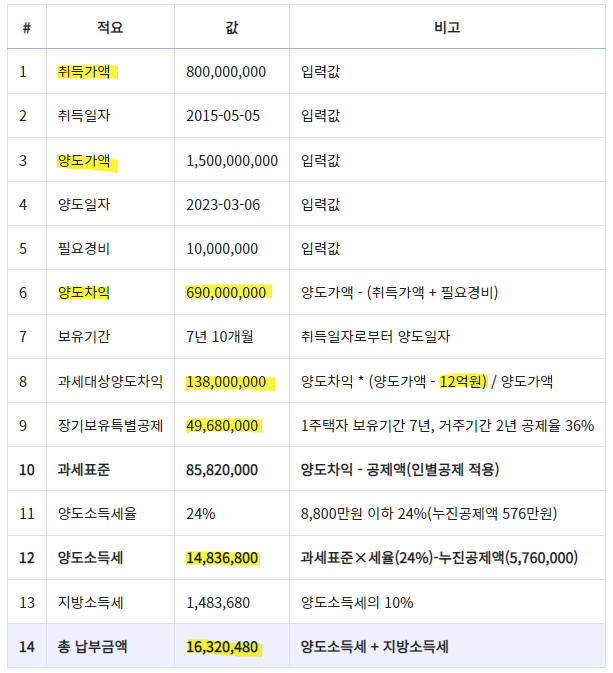 부연설명을 하자면, 양도차익이 6억9천만원이나 되지만 1주택 12억까지 비과세 혜택으로 인하여 과세대상 양도차익이 1억3,800만원으로 줄어들게 됩니다.