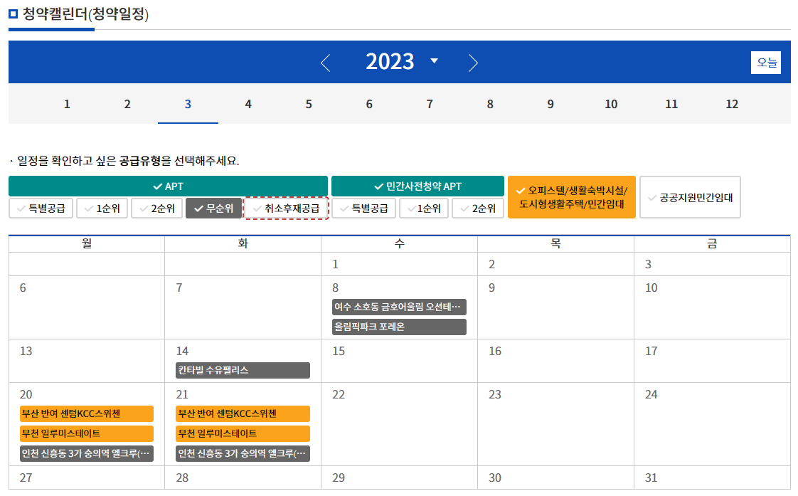 청약 홈 ▶ 청약 캘린더 ▶ 무순위 체크