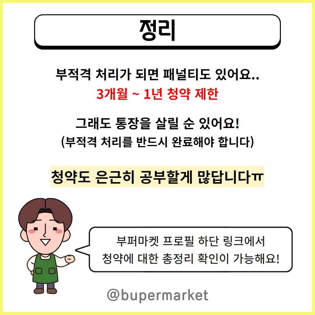 부적격 페널티는 지역에 따라 3개월에서 1년까지 청약제한에 걸리게 됩니다. 다만 배우자가 통장이 있다면 배우자가 청약에 임할 수 있습니다.