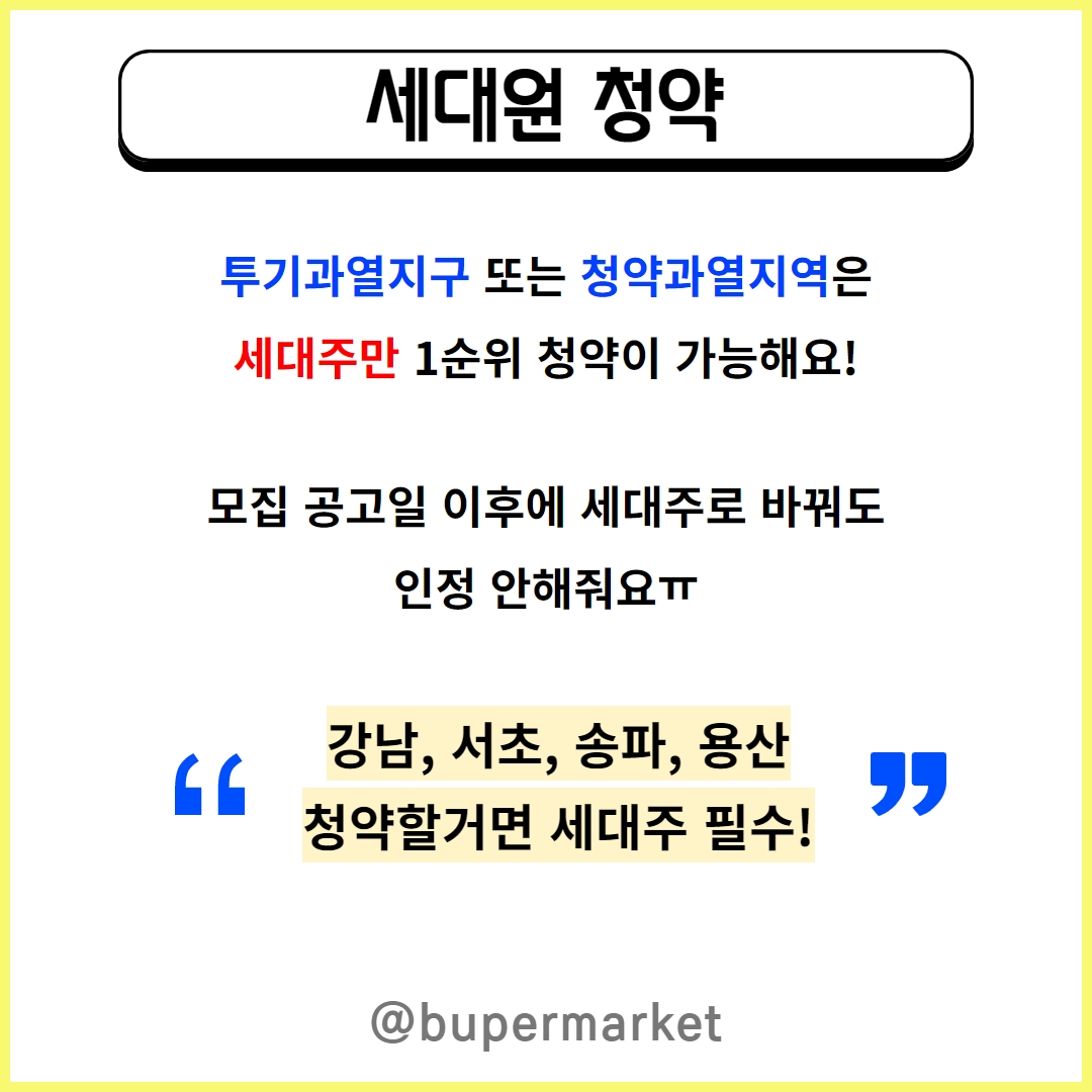 투기과열지구와 청약과열지역은 세대주만 1순위 청약이 가능합니다. 가끔 세대원이 청약을 하는 경우가 있는데 중간에 세대주로 변경하여도 인정받지 못합니다.