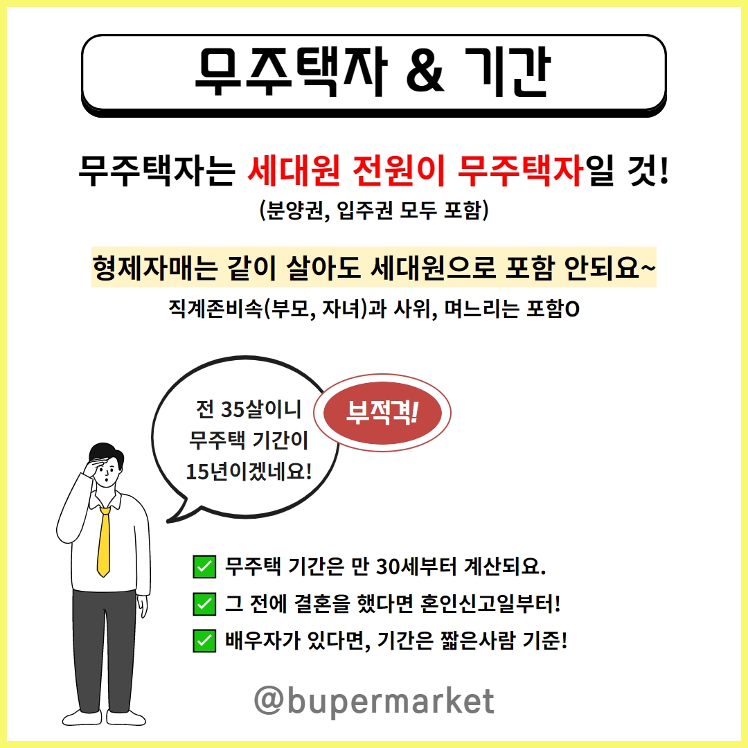 무주택 기간은 청약 신청자와 배우자를 모두 고려합니다. 직장으로 인하여 분리세대를 구성하고 있다고 해도 말이죠. 청약 신청자가 5년이고 배우자가 3년이라면, 무주택 기간은 3년으로 적용됩니다.